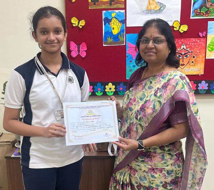 Revati Wagh from Class 9 has achieved an outstanding feat in the CISCE Swimming Competition securing: First Place in the 1500m Freestyle event. Silver Medal in the 400m Freestyle event As a result, Revati has been selected to represent our school in the CISCE National Competition! We extend our warmest congratulations to Revati Wagh on her exceptional achievement.