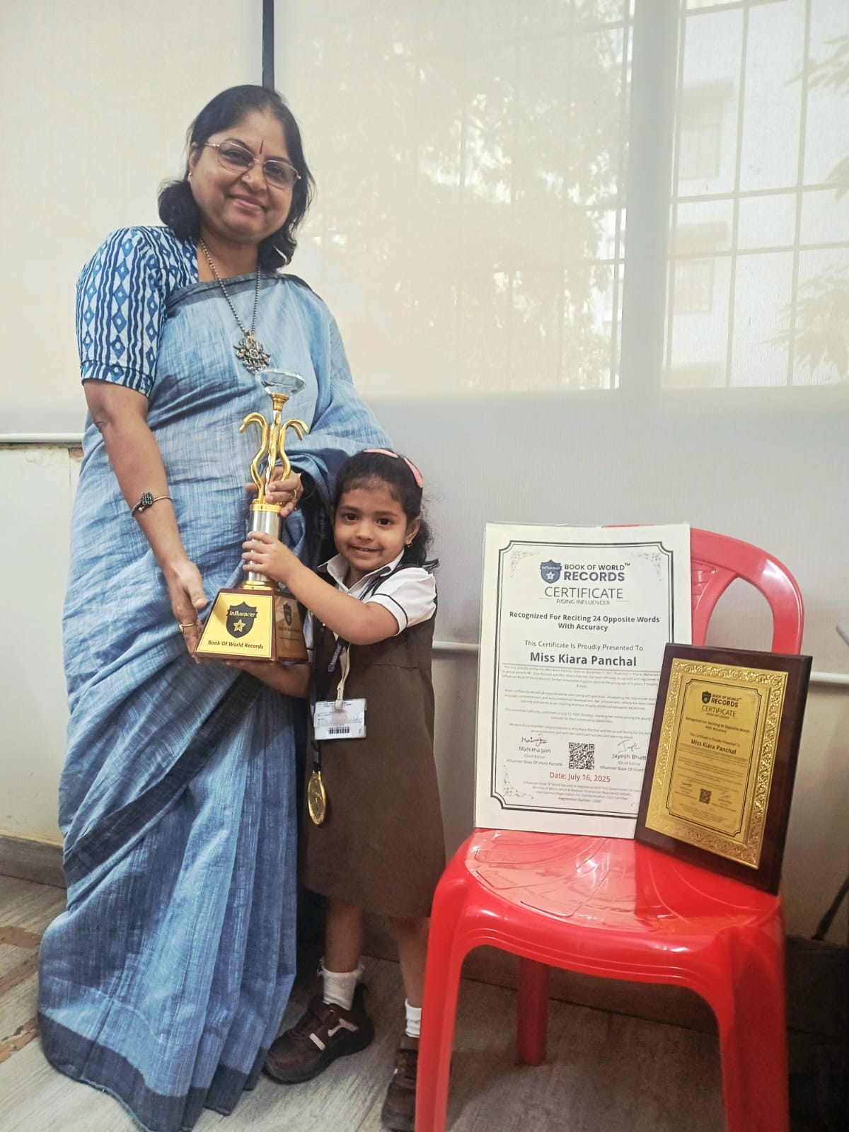 Kiara Panchal, a Jr. KG student has been officially recognized and registered in the Influencer Book of World Records for confidently reciting 24 opposite words with clarity and precision.