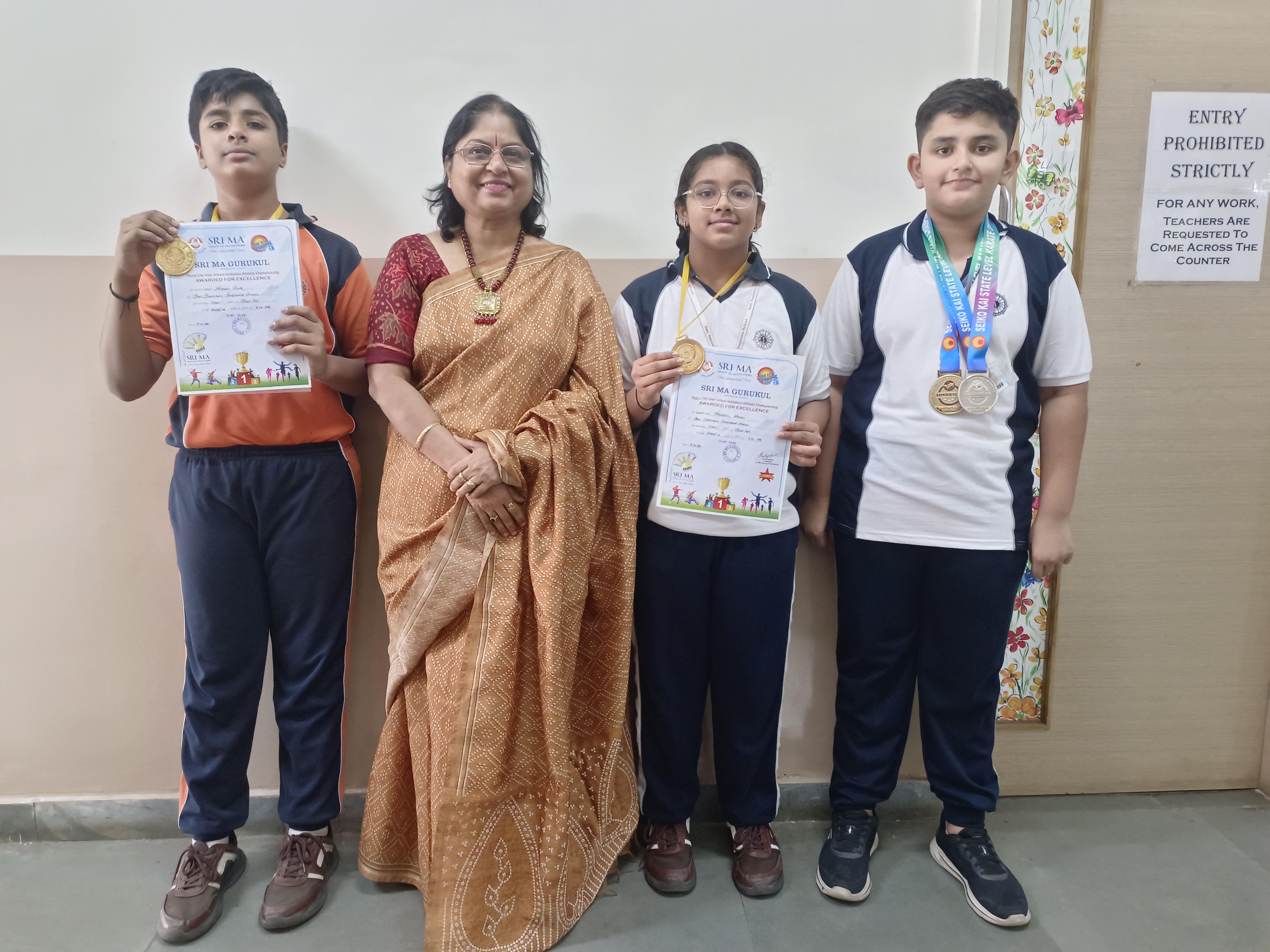 Arnav Iyer won a gold medal in Shot Put U/12 (3 kg) and Avani Arabatti secured 1st place in Shot Put (Girls U/12) at the Sri Ma Vidyalaya School Interschool Competition, while Shivash Joshi earned a gold and a silver medal at the Seiko Kai Karate State Level Championship.