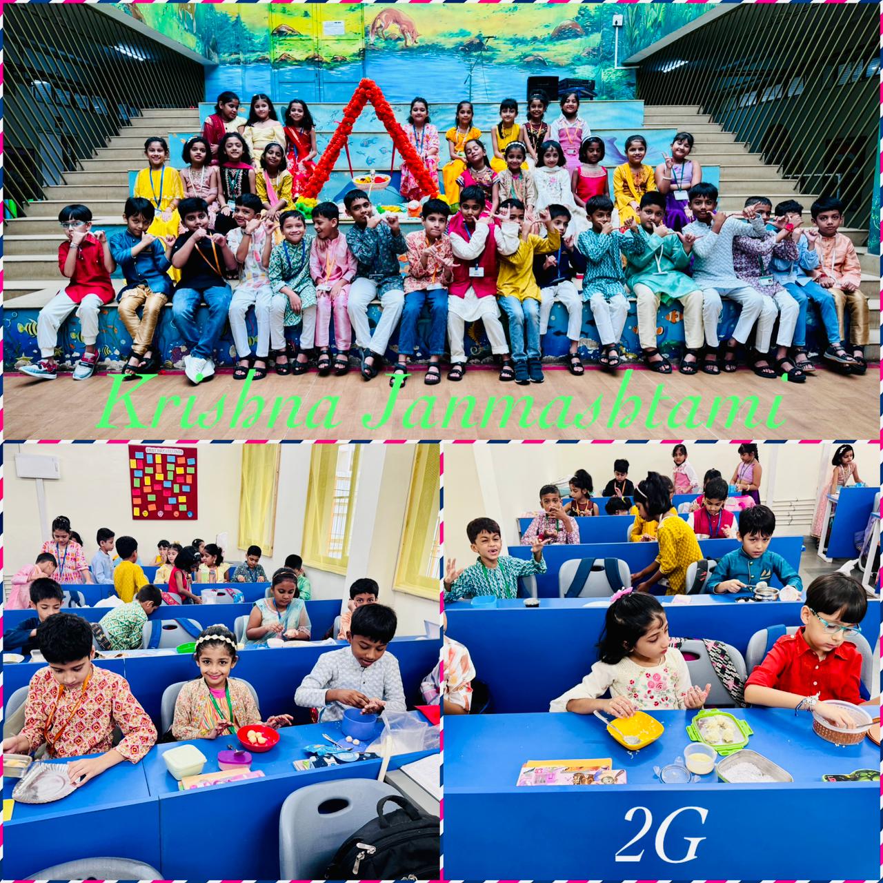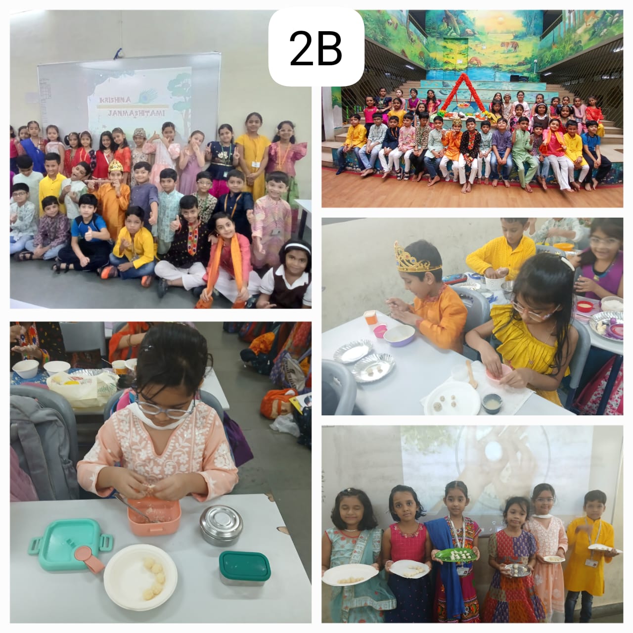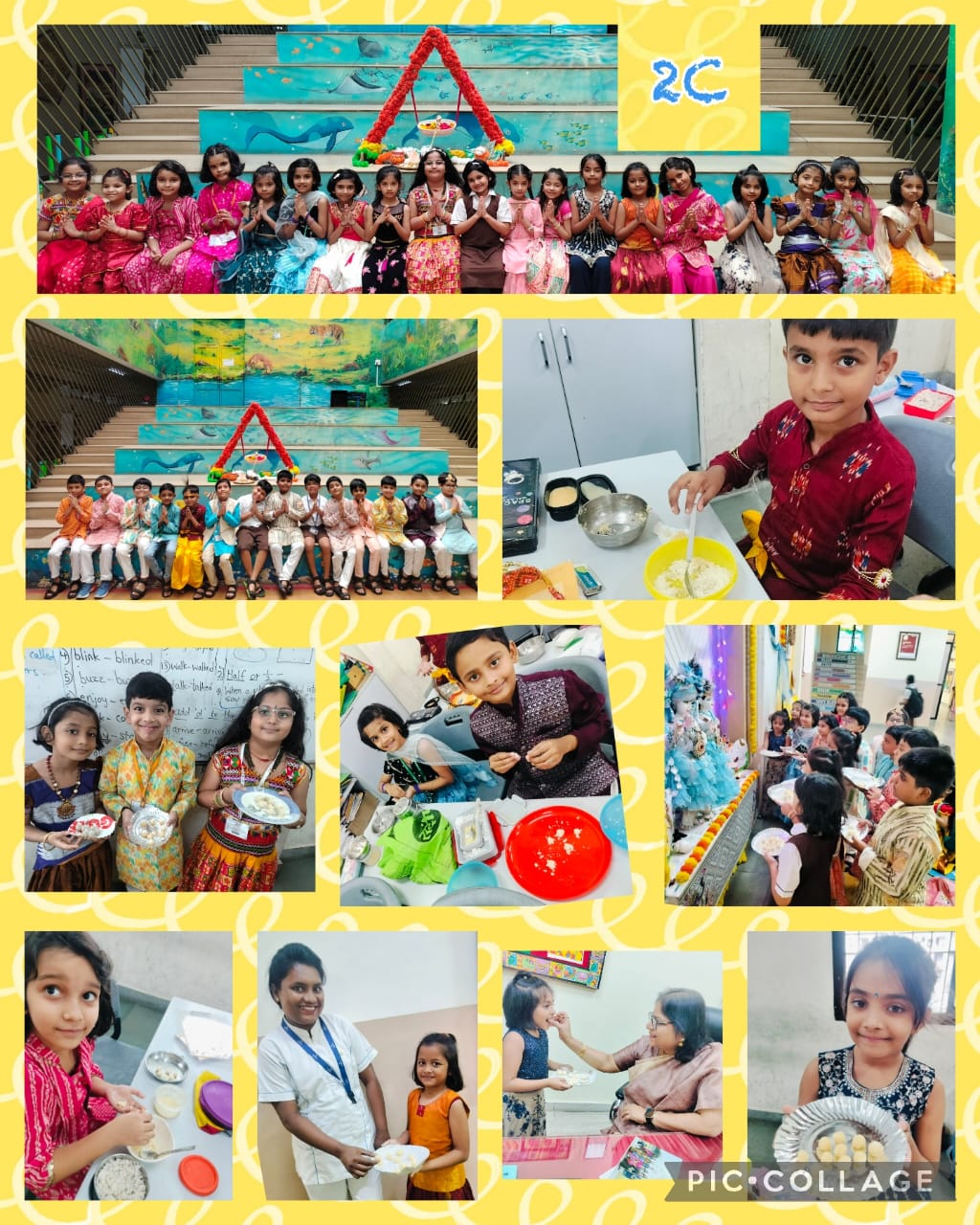 In colorful attire, so bright and grand, The students of Grade 2 took a joyful stand. With smiles so wide and spirits high, They celebrated Krishna with gleaming eyes. Laddoos they made with little hands, Coconut and milkmaid—what sweet plans! Spoons and bowls, all set in place, They mixed with love, at their own pace. Traditional dresses, twirls, and grace, A festive spirit filled the space. Janmashtami fun with laughter and cheer, Memories to hold so precious and dear.