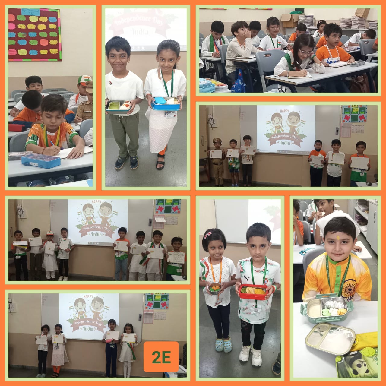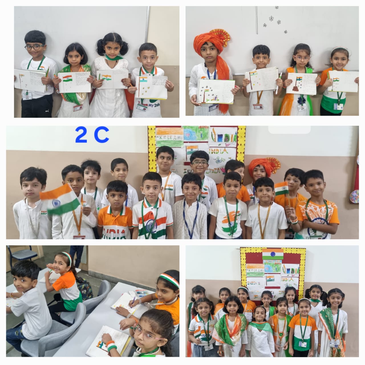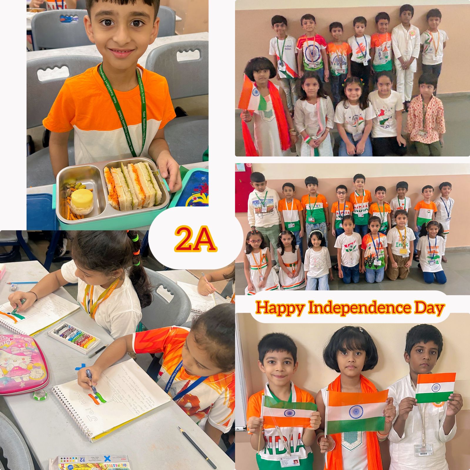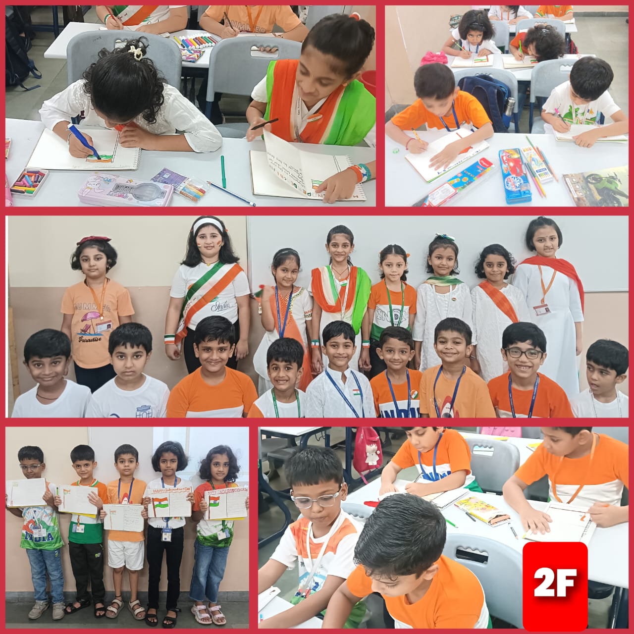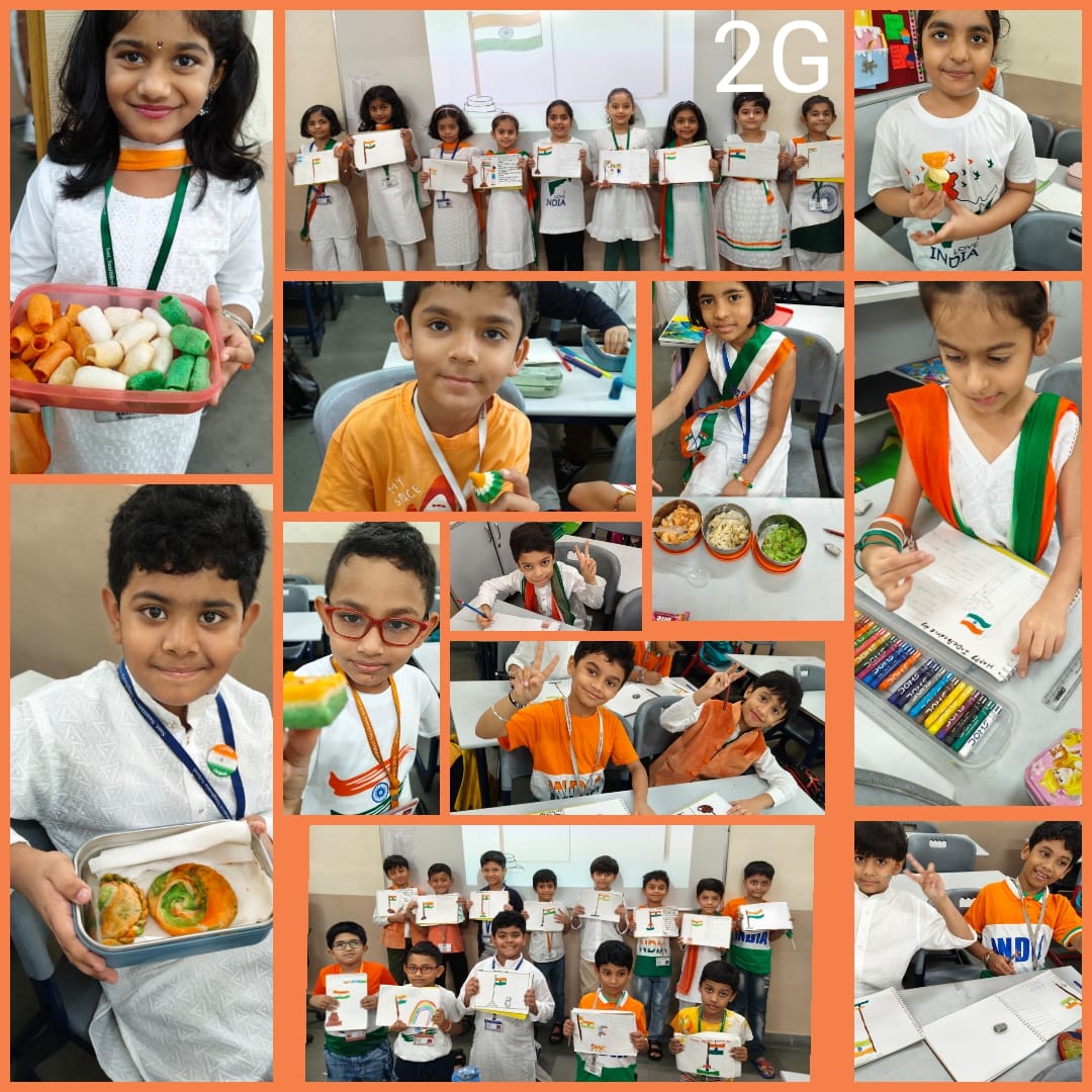 Independence Day Art Activity – Grade 2 To mark the 79th Independence Day, Grade 2 students took part in a creative art activity celebrating the pride and beauty of our national flag. The children drew and coloured our national flag using saffron, white, and green with the Ashoka Chakra carefully painted in blue at the centre. This activity not only encouraged creativity but also taught the students the meaning of each colour and the values it represents— courage and sacrifice, peace and truth, faith and prosperity. As a part of the activity, students also learned the basic rules of showing respect to the national flag. The classroom was filled with a sense of pride as each child held up their artwork. The activity not only enhanced their artistic skills but also deepened their understanding of India’s Independence Day and the values it represents.