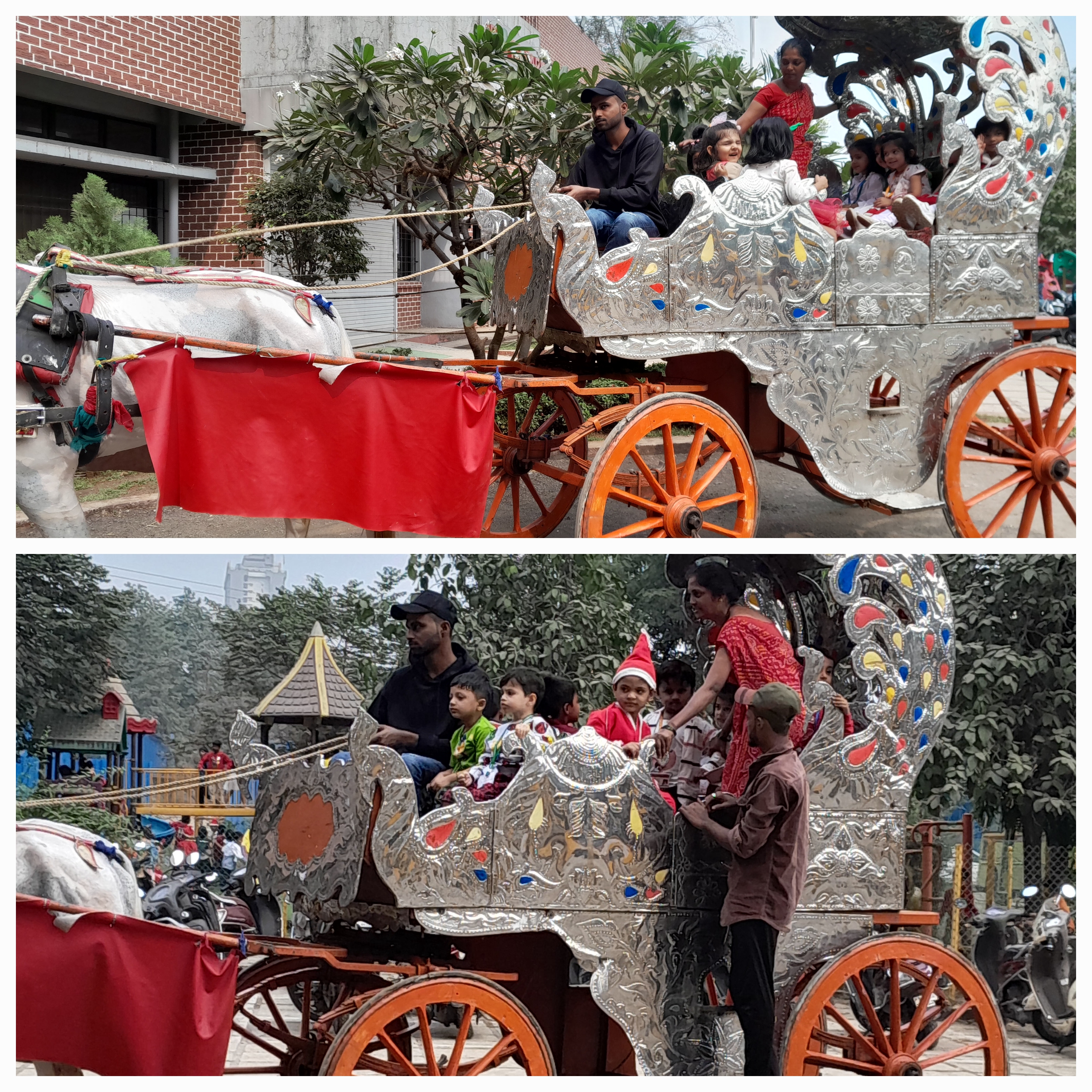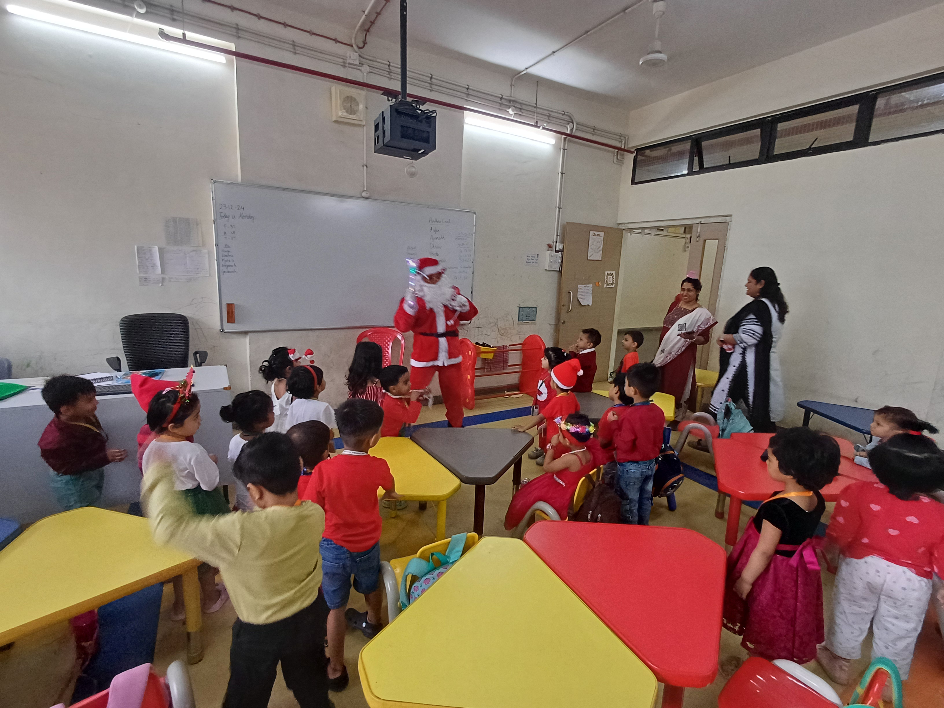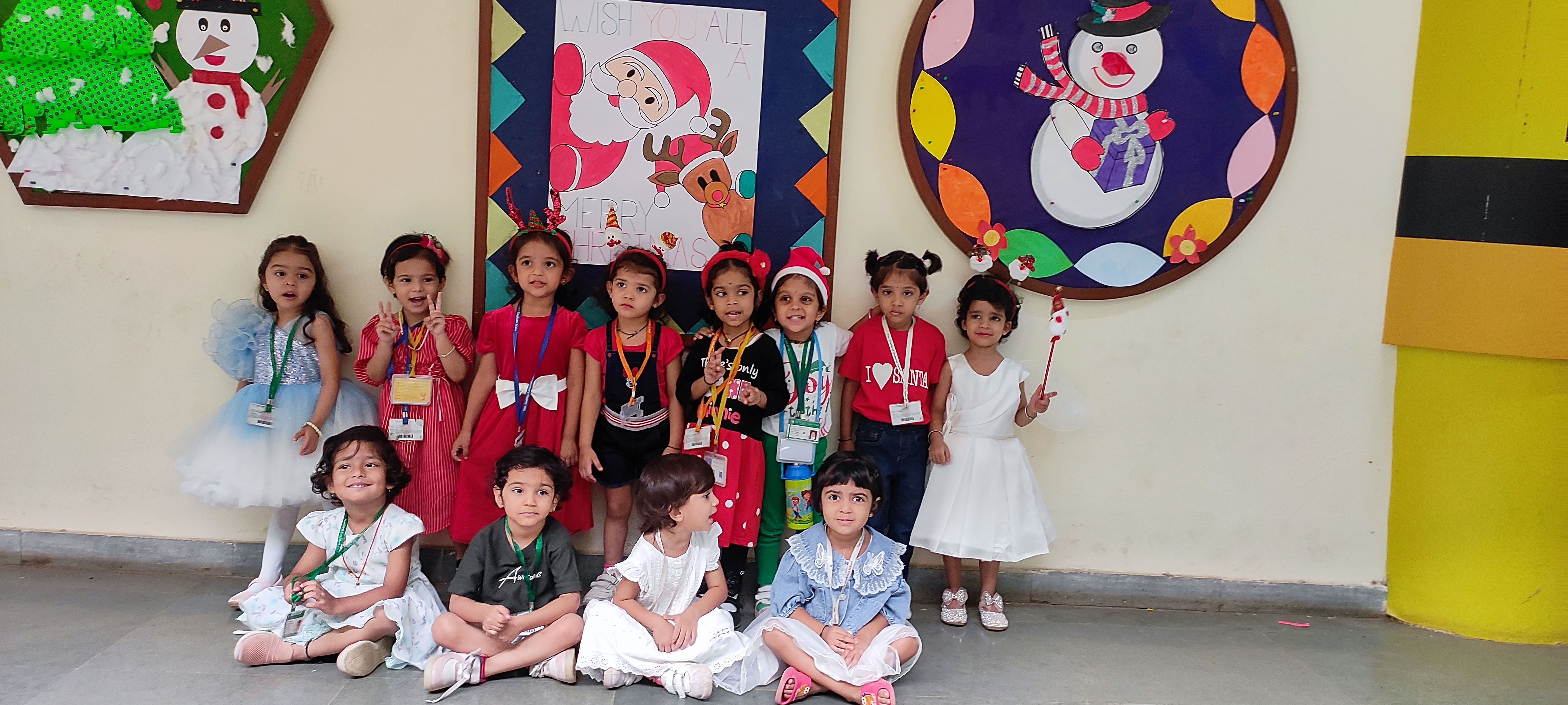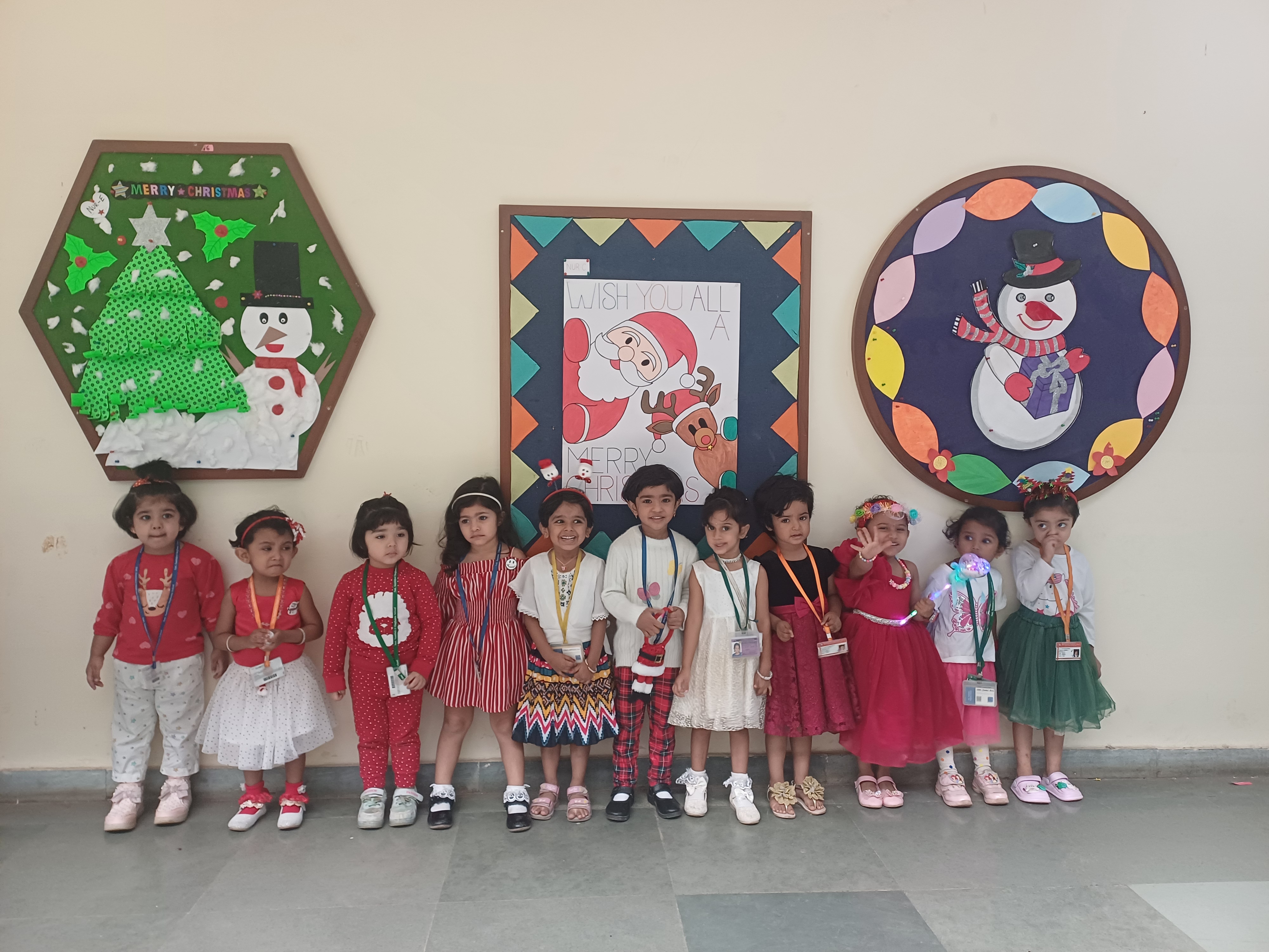 Our school radiated festive cheer as we celebrated the enchanting magic of Christmas. The joy and excitement of the season filled every corner, and our little ones brought the celebration to life with their boundless enthusiasm and charm. The Sr. KG children looked absolutely delightful in their Christmas-themed party attire. Dressed as Santa Claus, reindeer, snowmen, and other beloved holiday characters, they beautifully captured the spirit of the season. Adding to the festive joy, they brought along Christmas favorites such as plum cakes, cookies, and muffins. Each child also carried back home a lovingly crafted Santa face as a treasured keepsake of the celebration. The Jr. KG and Nursery children added a splash of festive colour with their vibrant outfits in red, green, and white. Their cheerful smiles and lively energy infused the school with warmth and happiness, perfectly embodying the true essence of Christmas. The beautifully decorated Selfie Stand was an instant hit among both the children and the teachers. Everyone gathered around to capture joyful moments, creating precious memories that will be cherished for years to come. Christmas celebrations are truly magical, and no celebration is complete without the beloved Santa Claus and his enchanting carriage. The highlight of the day was Santa’s surprise visit to the children’s classroom, where he spread joy and festive cheer all around. The children’s excitement reached new heights when they were given the unforgettable opportunity to ride with Santa in his beautifully decorated carriage, making the day even more special and memorable. This celebration was not just about fun and festivities but also an opportunity to impart the deeper meaning of Christmas to our young learners, the values of sharing, kindness, and spreading love. The school echoed with laughter and delight, creating an unforgettable, heartwarming festive atmosphere. Wishing all our little stars a Merry Christmas filled with endless love, joy, and wonder.
