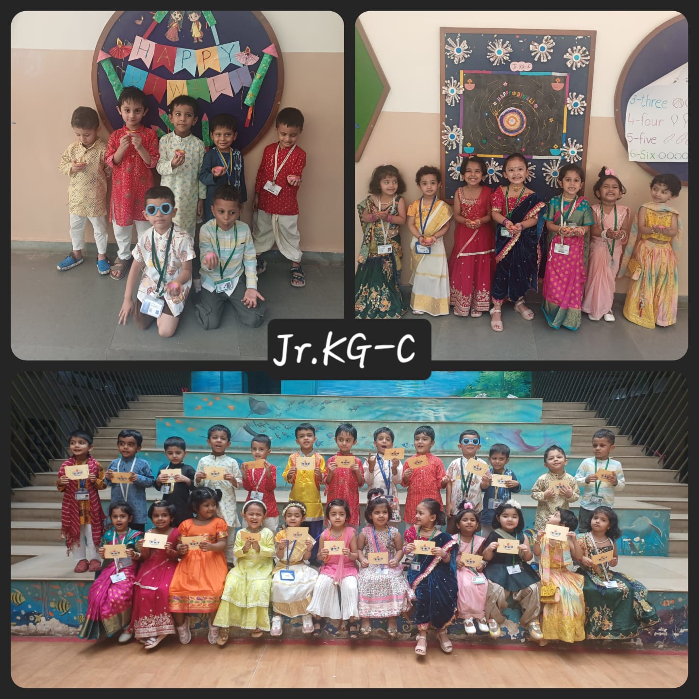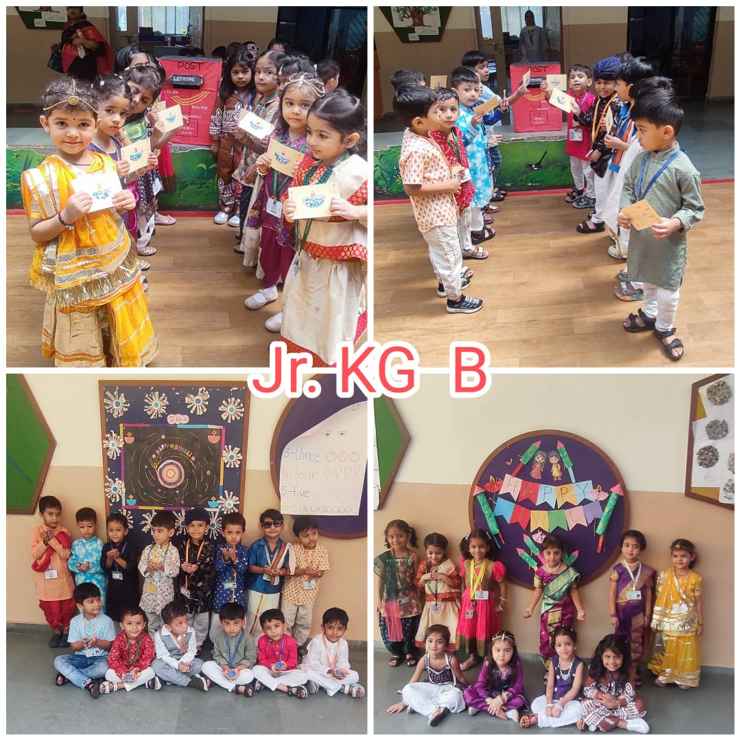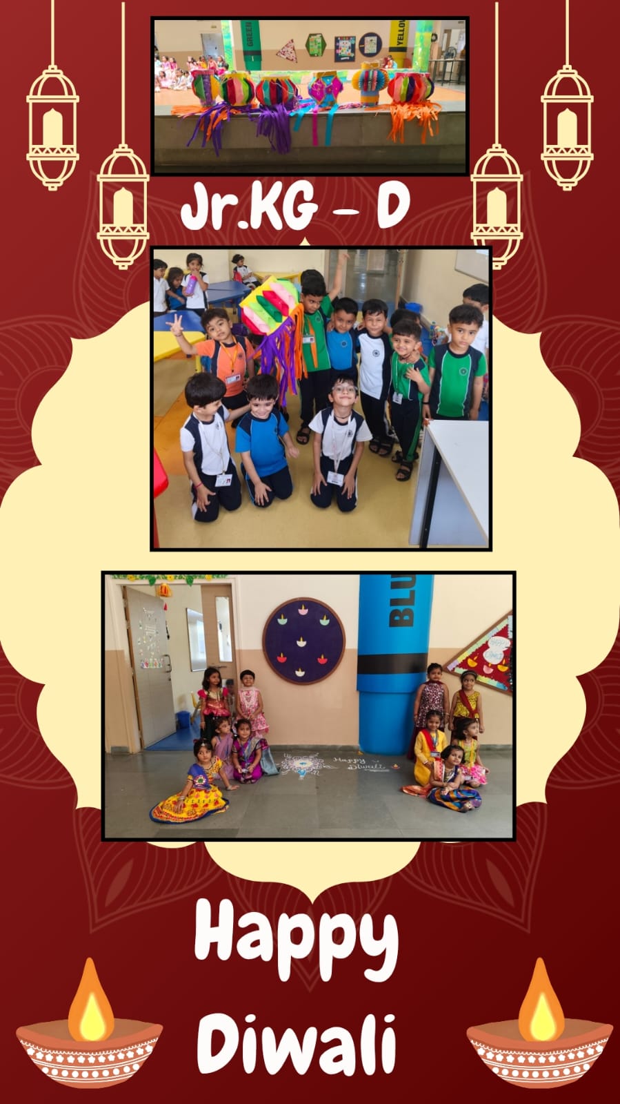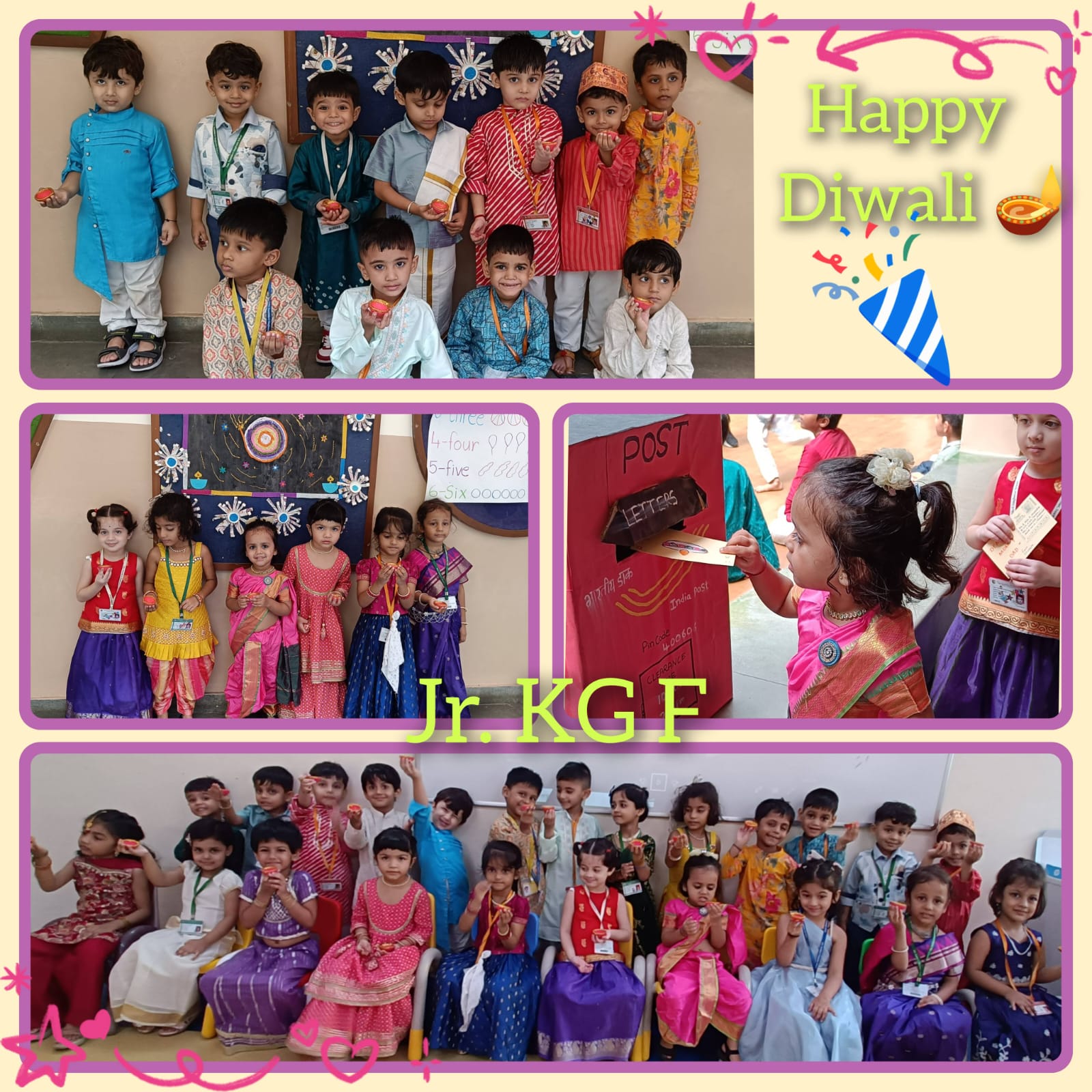 The festival of lights, Diwali, was celebrated with great joy and enthusiasm by the little ones of Junior KG at our school. The tiny tots came dressed in bright traditional clothes, adding charm and colour to the celebration. To introduce the children to the significance of Diwali, teachers narrated simple stories about the festival and its traditions. The kids enjoyed listening and learning about why we celebrate Diwali – the victory of good over evil and light over darkness. The children participated in fun activities such as:  Diya decoration  Making paper lanterns  Singing festive songs and rhymes  Post card making Laughter, happiness, and festive cheer filled the air as the little ones danced, shared sweets, and enjoyed the spirit of togetherness. The celebration ended with a gentle reminder to celebrate a safe and eco-friendly Diwali. It was a day full of light, love, and lots of smiles!