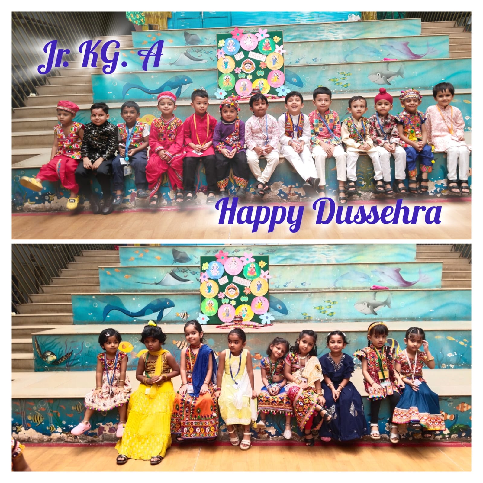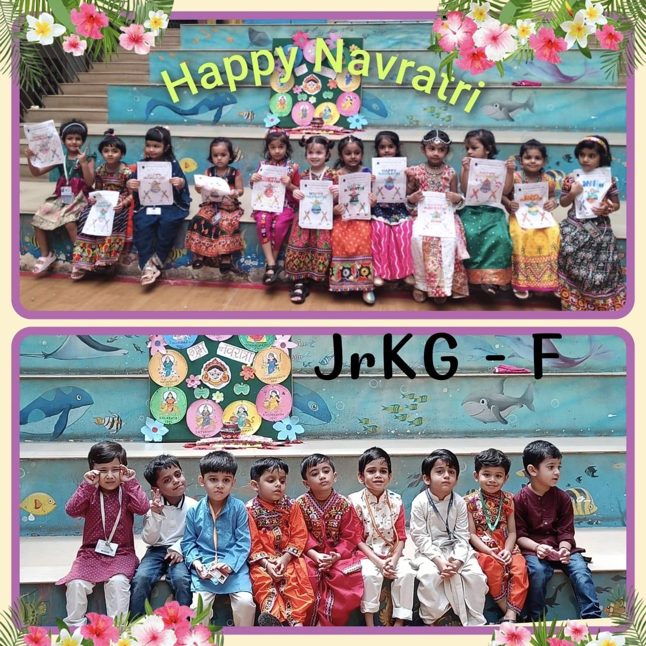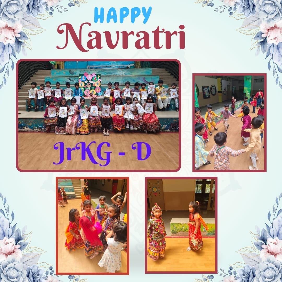 Our Kindergarten children joyfully celebrated Navratri and Dussehra with enthusiasm and festive spirit. The little ones came dressed in beautiful traditional attire and enjoyed the celebration with songs, stories, and activities related to the Navratri festival. The significance of good triumphing over evil was shared with the children in a fun and simple way, helping them understand the essence of the festivals. The children also participated in a creative Dussehra leaf activity, adding a hands-on experience to the celebration. Our Junior KG children decorated a festive Navratri worksheet that featured a Kalash with a coconut and a greeting “HAPPY NAVRATRI”. The little ones joyfully decorated the Kalash, creating shining patterns that reflected their imagination. The day ended on a joyful note with festive treats and happy smiles all around.