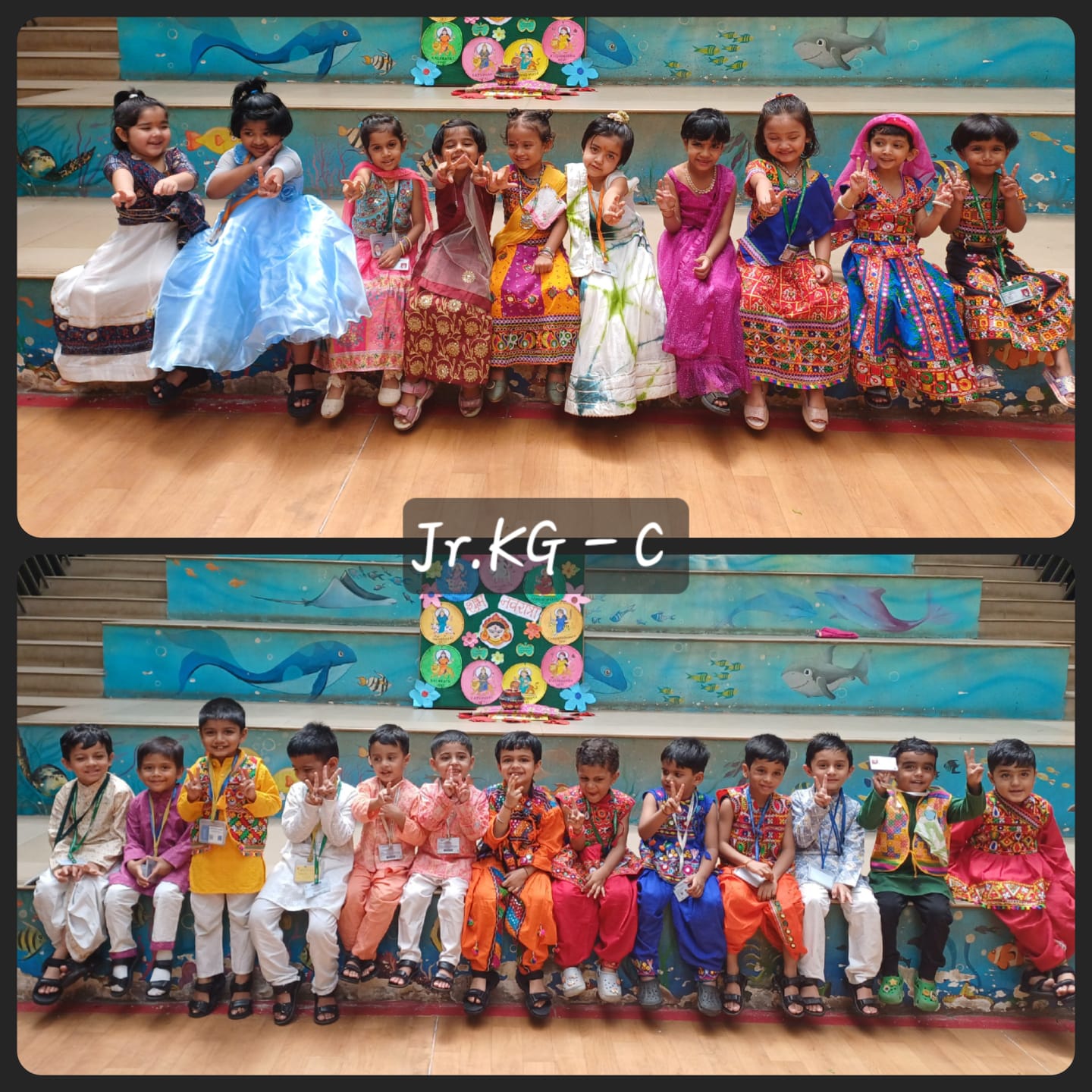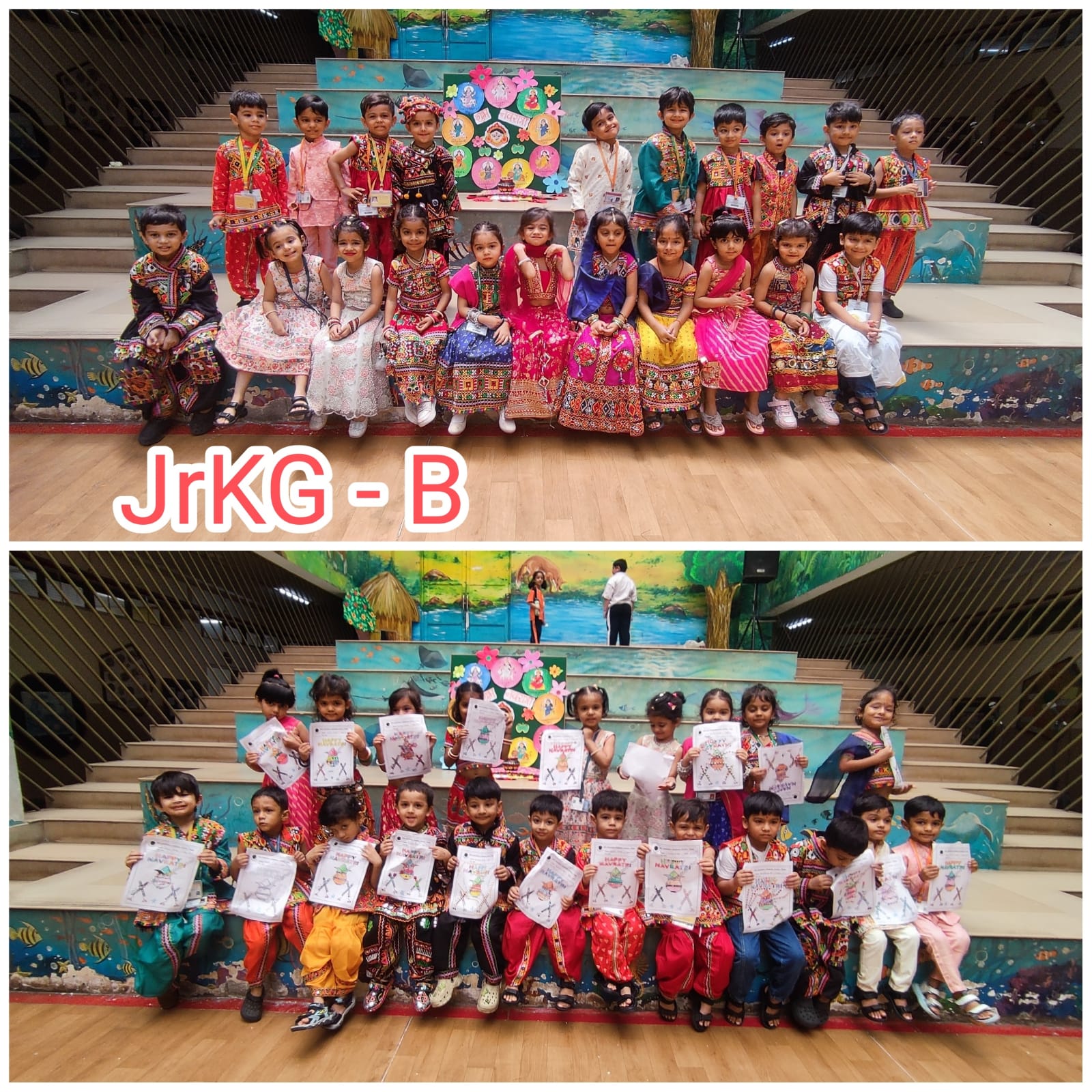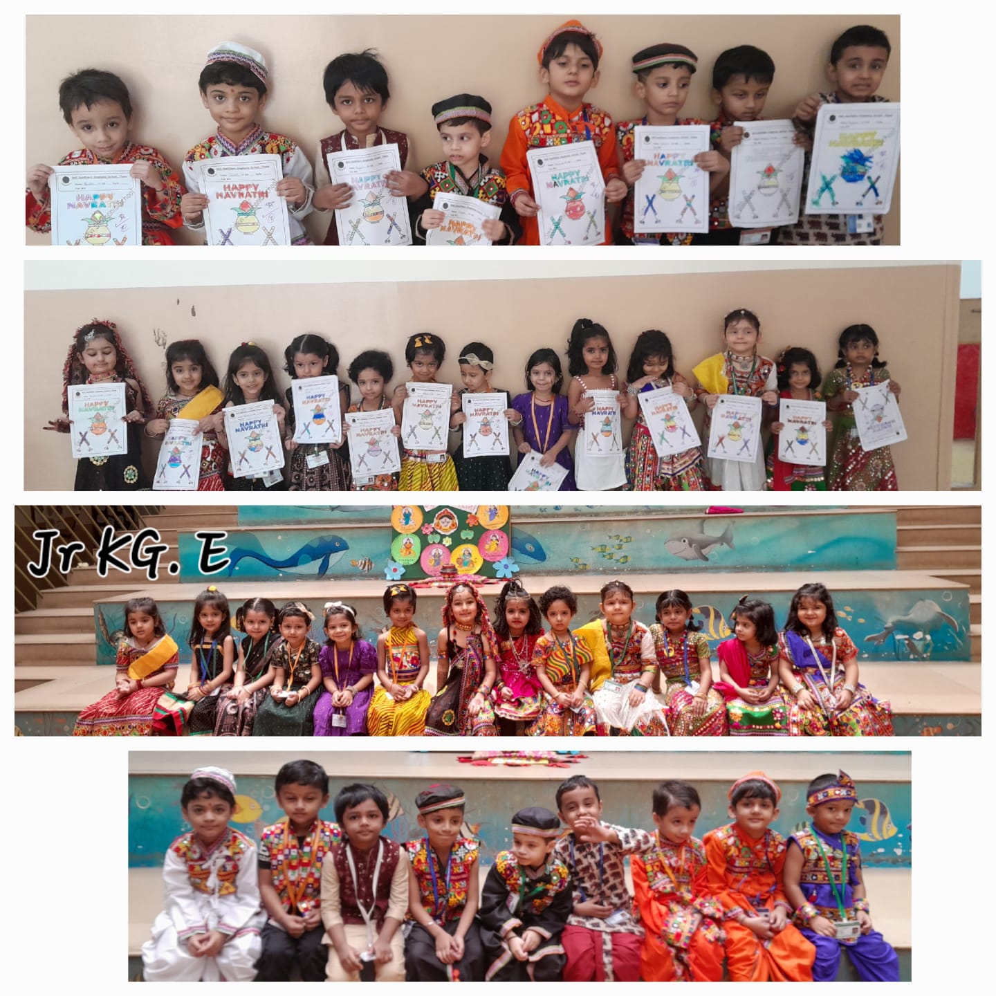 Our Kindergarten children joyfully celebrated Navratri and Dussehra with enthusiasm and festive spirit. The little ones came dressed in beautiful traditional attire and enjoyed the celebration with songs, stories, and activities related to the Navratri festival. The significance of good triumphing over evil was shared with the children in a fun and simple way, helping them understand the essence of the festivals. The children also participated in a creative Dussehra leaf activity, adding a hands-on experience to the celebration. Our Junior KG children decorated a festive Navratri worksheet that featured a Kalash with a coconut and a greeting “HAPPY NAVRATRI”. The little ones joyfully decorated the Kalash, creating shining patterns that reflected their imagination. The day ended on a joyful note with festive treats and happy smiles all around.