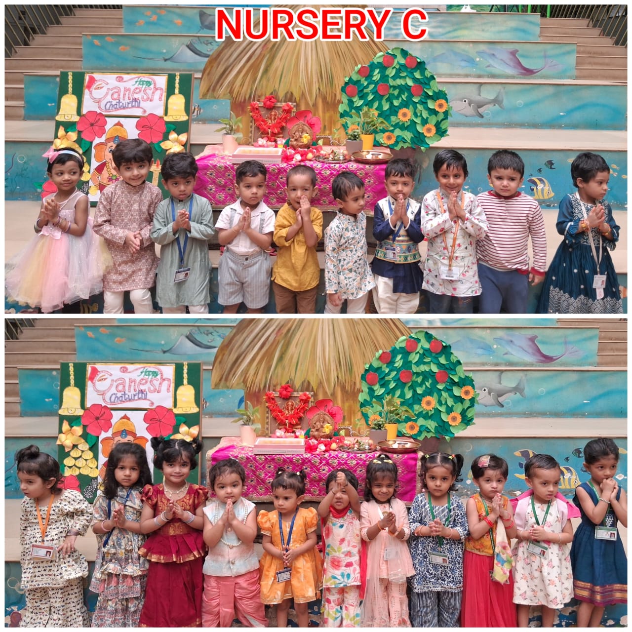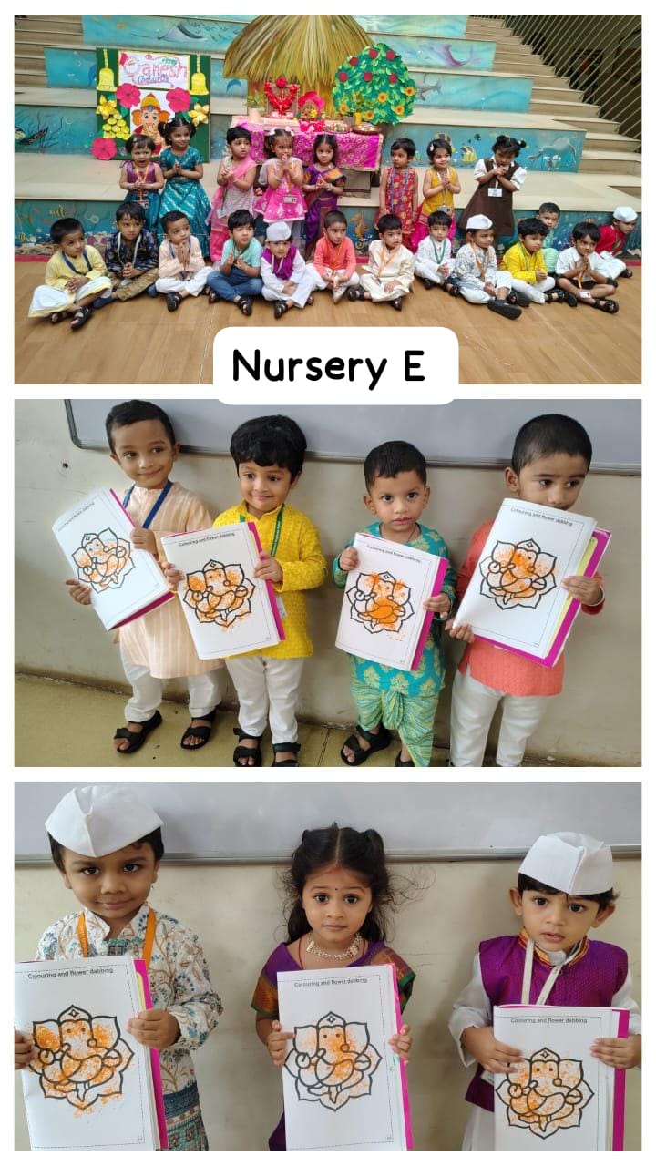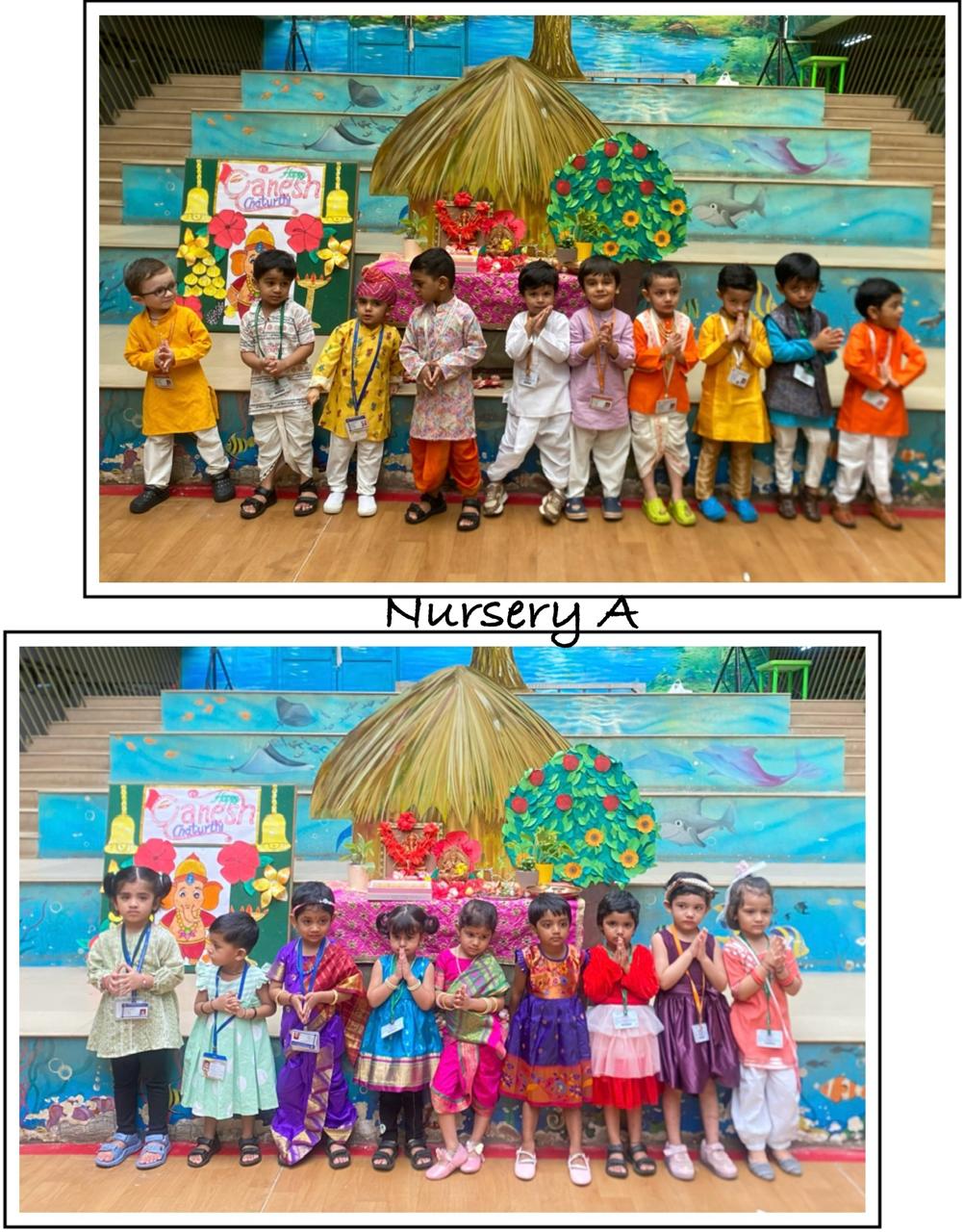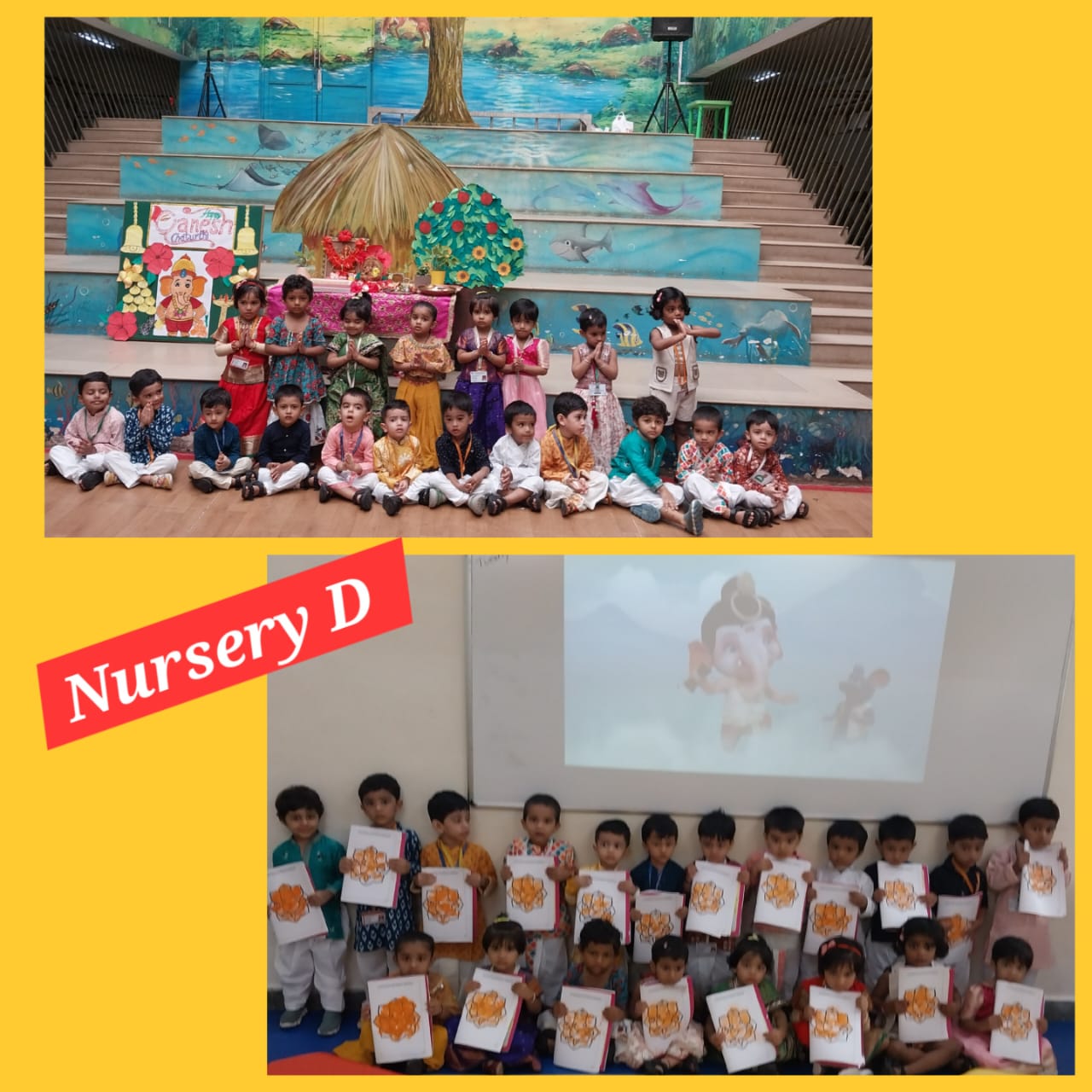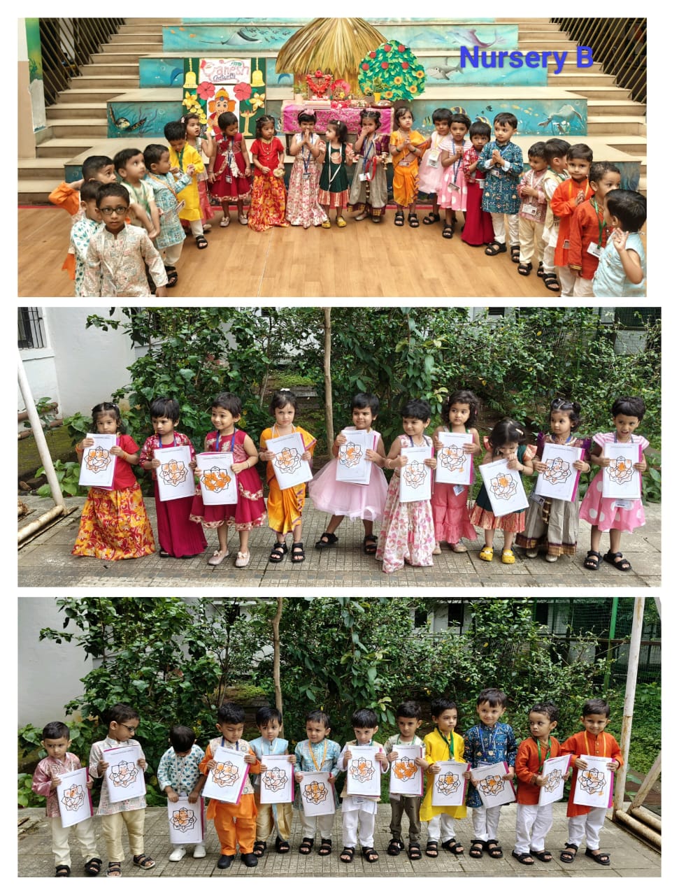 Ganesh Chaturthi, one of the most loved festivals of India, is celebrated with great devotion and joy. It marks the birth of Lord Ganesha, the remover of obstacles and the giver of wisdom, prosperity, and happiness. At our school, we believe that festivals are a wonderful way to teach children about culture and values. To celebrate this occasion, our little ones from Nursery and Jr. KG took part in special activities that filled the day with excitement and festive spirit. The children came dressed in colorful traditional Maharashtrian attire — dhoti, kurta, navari saree, and pheta — which brought alive the essence of the festival. Nursery students painted pictures of Lord Ganesha using the flower dabbing technique, while Jr. KG children explored their creativity through rangoli painting, okra printing, paper twisting, and dabbing. Together, they prepared a bright and beautiful collage of Ganapati Bappa and pooja elements. To add sweetness to the day, children also brought Bappa’s favorite treats — modak and ladoo. For our little learners, such celebrations are more than just fun. They help children express their creativity, enjoy working together, and understand the meaning of our traditions. Above all, the festival reminded them of Lord Ganesha’s teachings — to be wise, kind, and brave while facing challenges. The celebration not only filled the school with joy and devotion but also created lasting memories for our tiny tots. May Lord Ganesha bless all our children with happiness, good health, and success always.