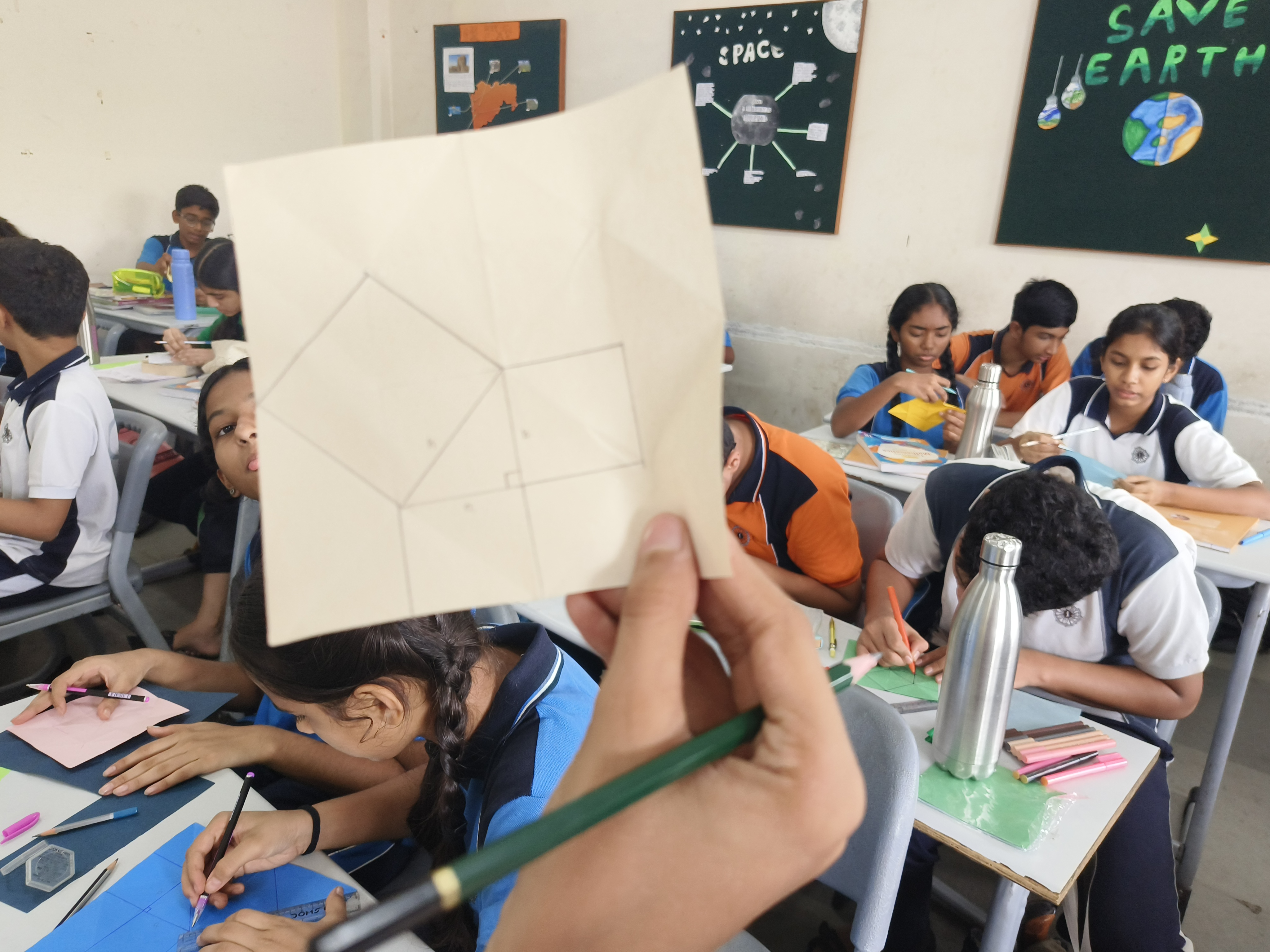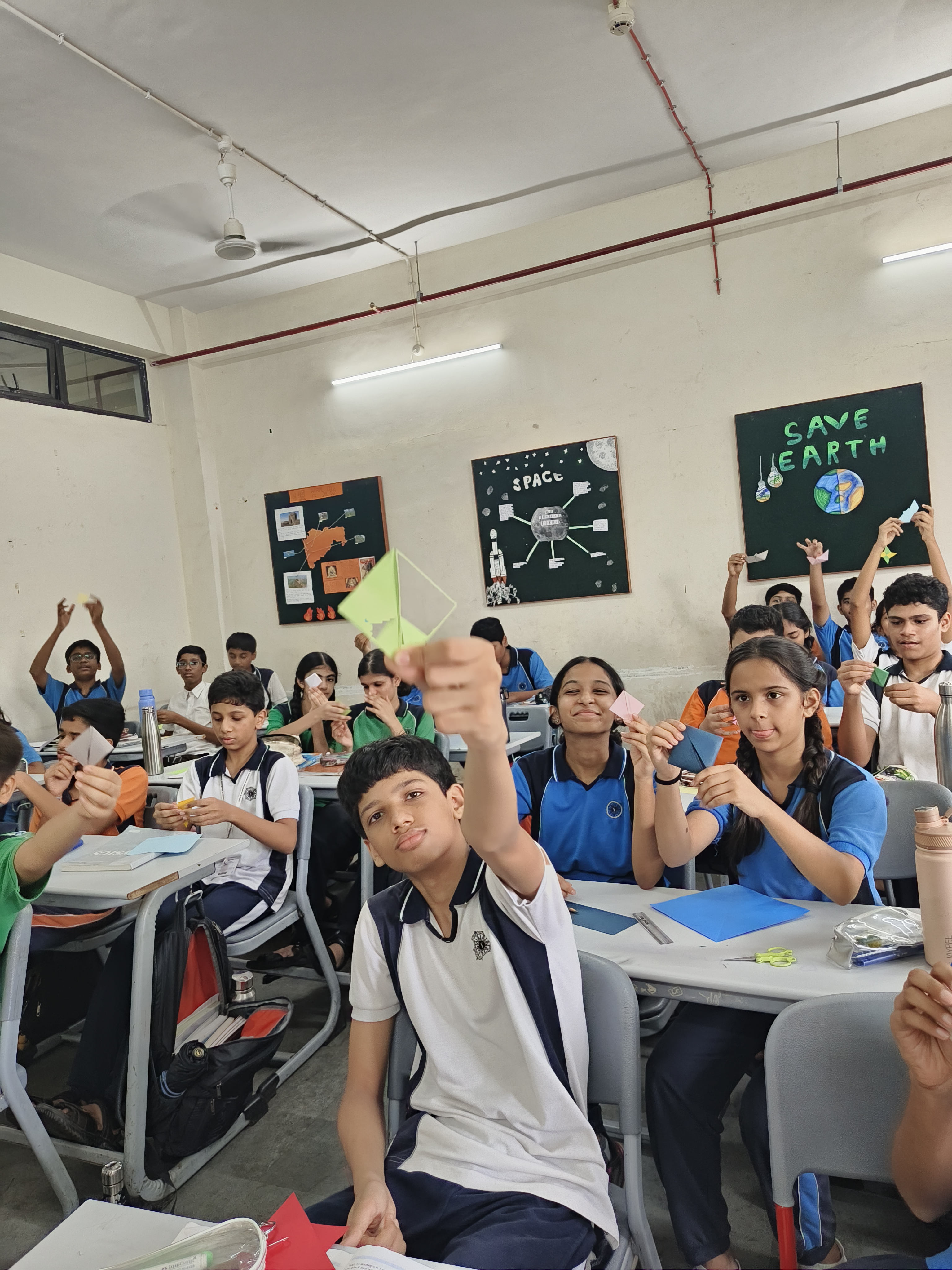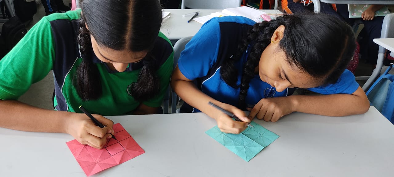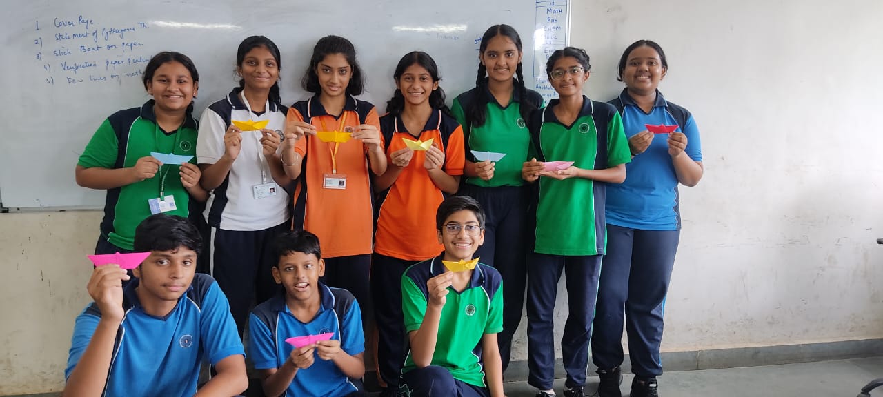 “Understanding the principles of geometry opens the door to comprehending the world around us.” Integrating art with math is not just fun but also develops curiosity in children to learn. Grade 9 students were engaged in a hands-on activity to understand and verify the Pythagoras Theorem, using origami paper (square sheet). They were required to make a paper boat from the sheet and then unfold it. The next step was to look out for right-angled triangles. They needed to mark the sides of one of the triangles and their adjoint squares. After this, the verification was done by calculating the areas of each of the squares. By engaging students in this interactive and hands-on activity, the students refreshed their childhood memories of making paper boats and developed a deeper understanding of the Pythagoras Theorem.