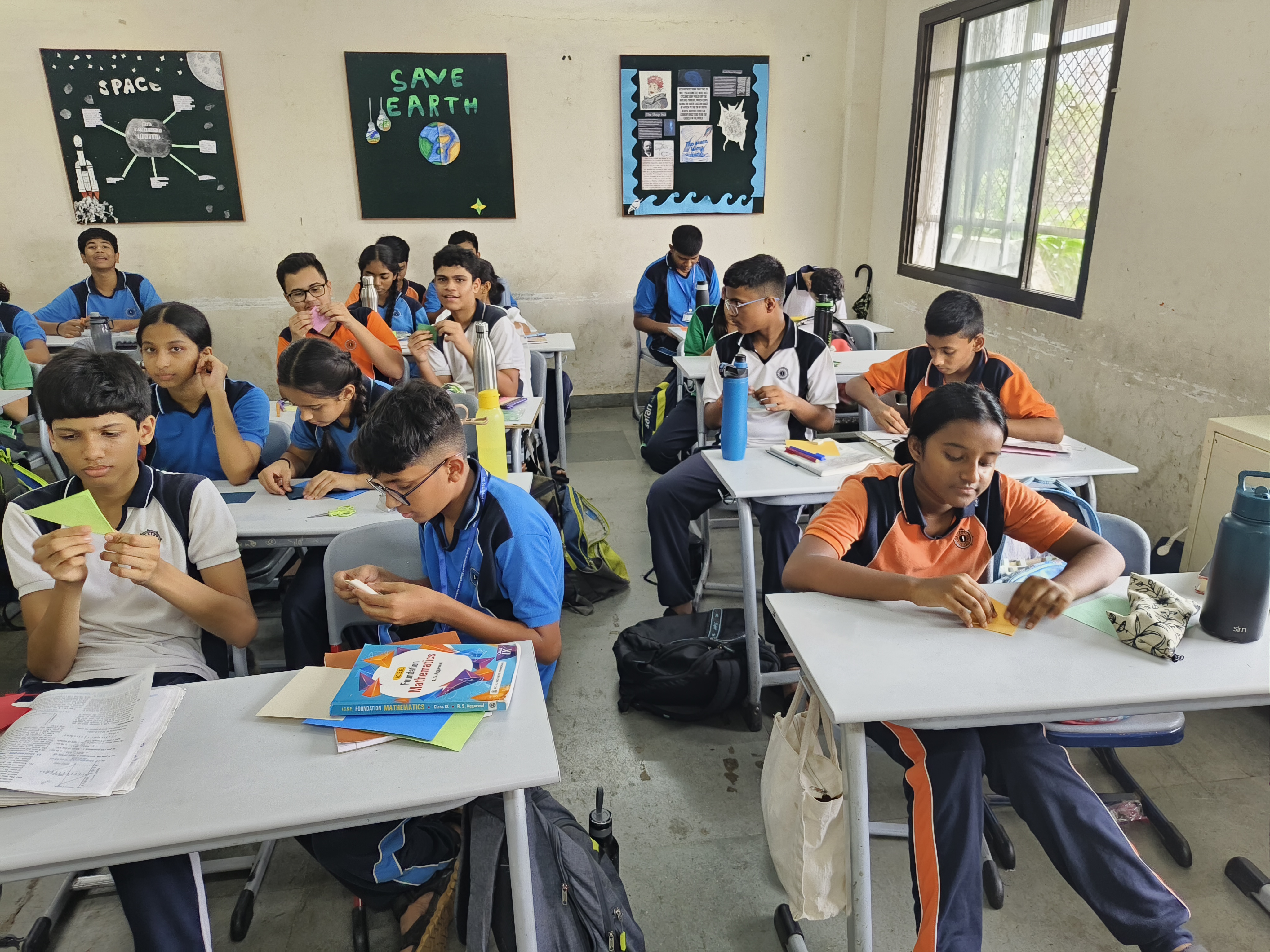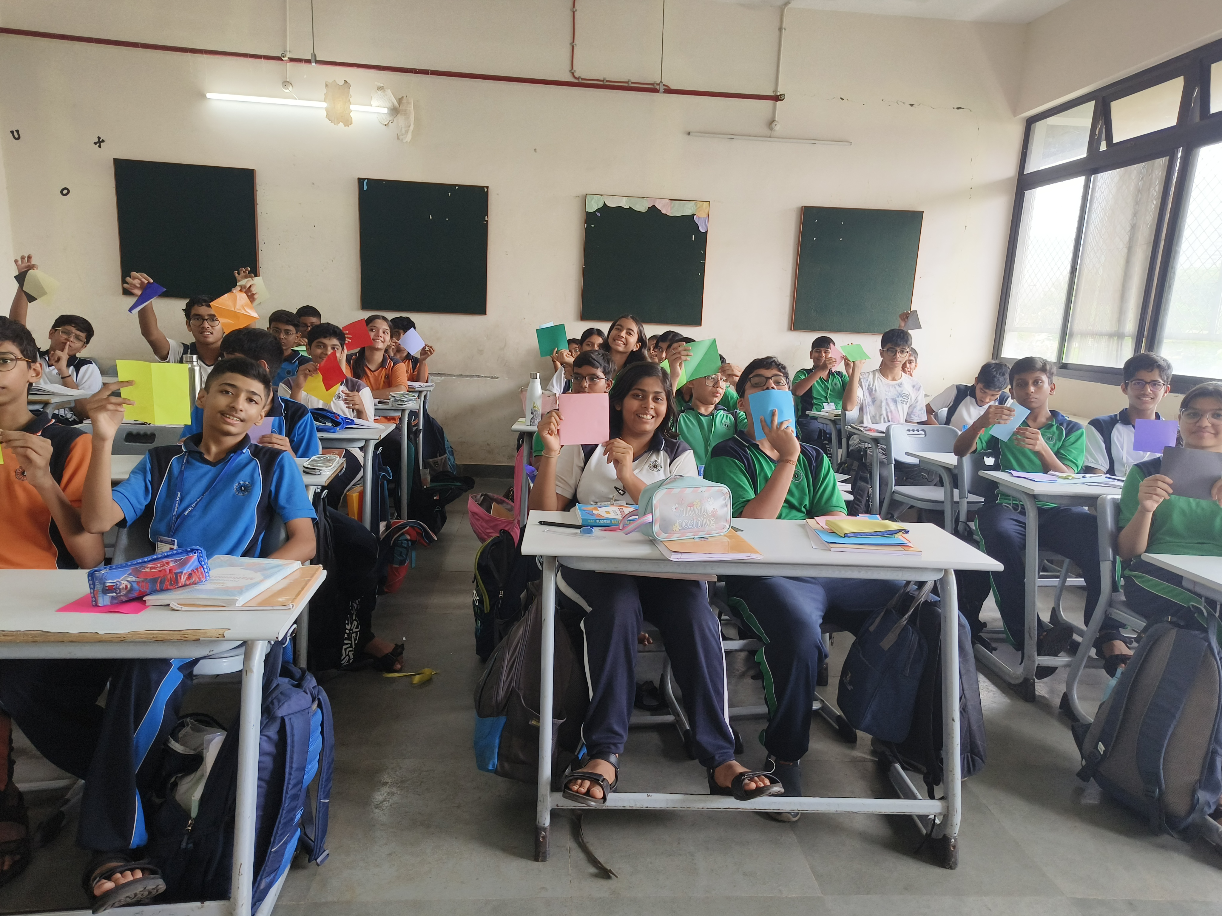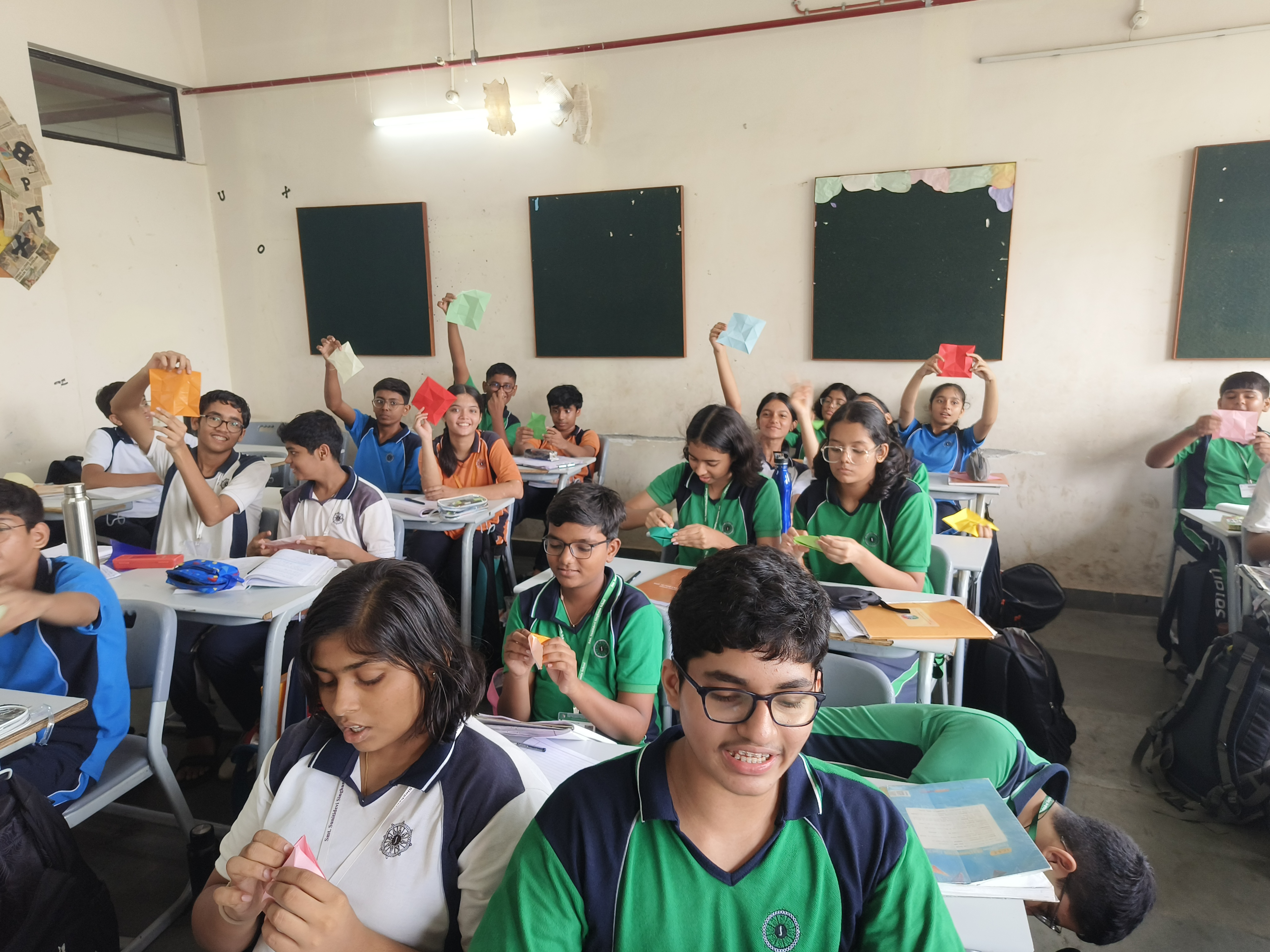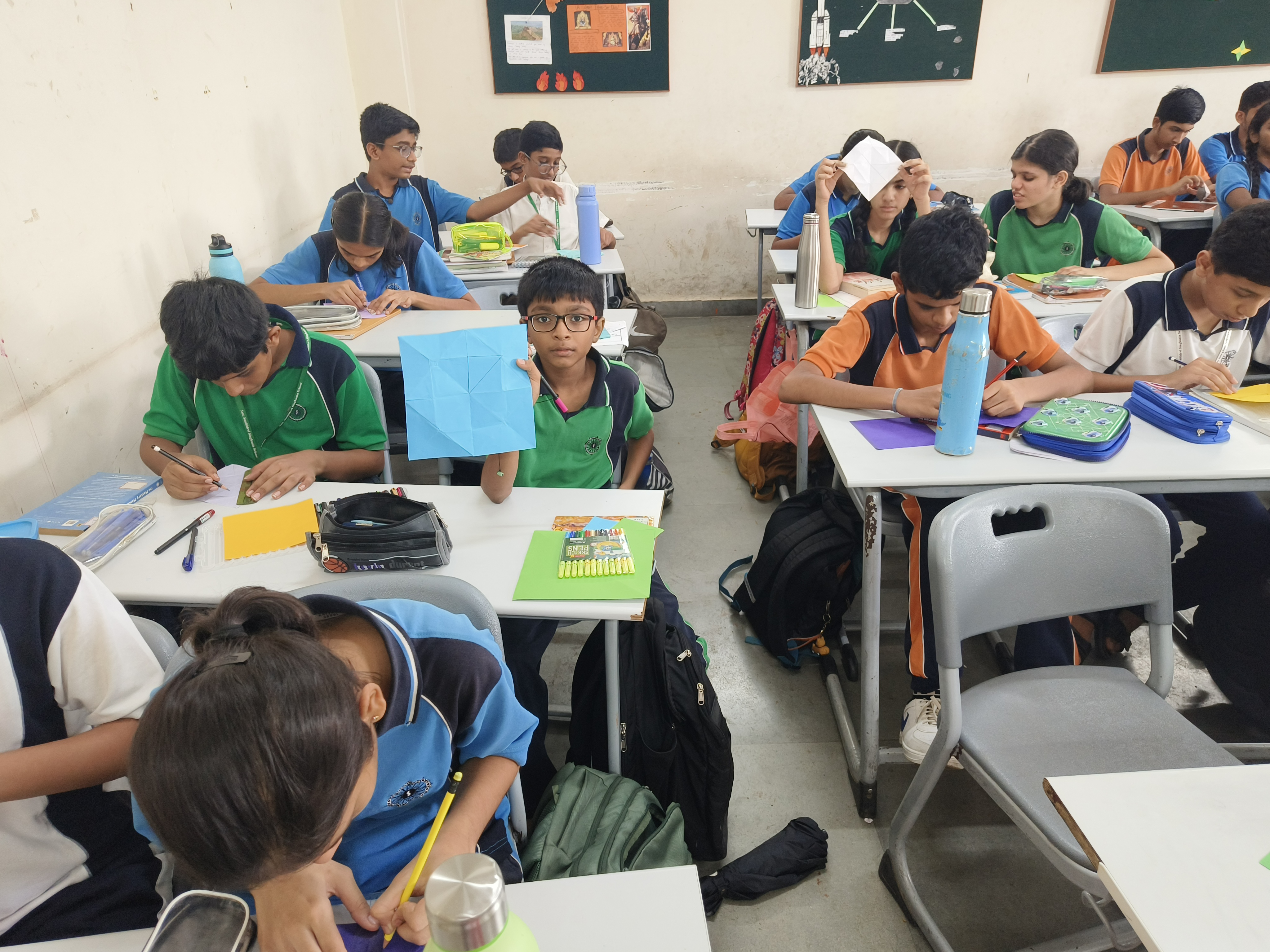 “Understanding the principles of geometry opens the door to comprehending the world around us.” Integrating art with math is not just fun but also develops curiosity in children to learn. Grade 9 students were engaged in a hands-on activity to understand and verify the Pythagoras Theorem, using origami paper (square sheet). They were required to make a paper boat from the sheet and then unfold it. The next step was to look out for right-angled triangles. They needed to mark the sides of one of the triangles and their adjoint squares. After this, the verification was done by calculating the areas of each of the squares. By engaging students in this interactive and hands-on activity, the students refreshed their childhood memories of making paper boats and developed a deeper understanding of the Pythagoras Theorem.
