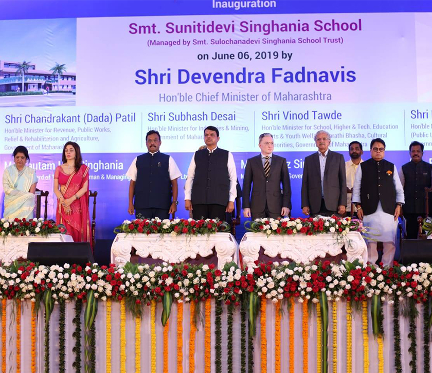 The Board of Trustees of Smt. Sulochanadevi Singhania School, Thane including, Mr. Gautam Singhania, Chairman, Managing Director of Raymond Ltd., Ms. Nawaz Singhania, Member, Board of Governors with Ms. Revathi Srinivasan, Director & Principal of Sulochanadevi School made the event more luminous and effortless with their honorable presence. The school was inaugurated by the hands of our Honourable Maharashtra Chief Minister, Mr. Devendra Fadnavis in the presence of other dignitaries from the Ministry of the Maharashtra Government like Shri. Chandrakant (Dada) Patil, Minister for Revenue, Public Works, Relief, and Rehabilitation & Agriculture, Shri. Subhash Desai, Minister for Industry & Mining, Shri. Vinod Tawde, Minister for School, Higher & Tech. Education, Sports & Youth Welfare, Marathi Bhasha, Culture & Minorities, Shri. Eknath Shinde, Minister for Public Works, Shri. Vijay Darda, Chairman, and Editor-in-Chief, Lokmat, adding their sparkle to the occasion.